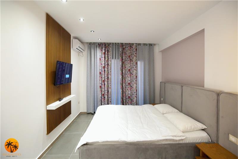 Palm Suites Apart-hotel is located in Vlore, just 1.6 km from city center and only 50 meters from the beach, in one of the most beautiful areas of the city, Lungomare. Guests can enjoy an impressive view and all the other facilities offered by the surrounding area. At a distance of 50m away it has market, taxi/bus station, bakery, pharmacy, tennis/football/basketball fields, promenade, public and private beaches. During summer there are many bars, restaurants and night clubs around the area. There is also public transport taking you to the city or in Southern Albania to explore other beaches.All apartments are equipped with an air conditioner, a flat-screen cable TV, seating area, fridge and kettle. Private bathroom come with a shower, bidet, free toiletries and a hairdryer. Every suites features a balcony with sea views. Some of them, per 4 people, have a private kitchen. Free parking and Wi-Fi is available. The structure also has a private elevator and reception desk. Apart-hotel staff is really friendly and works to offer their guests the best service in hospitality and a really clean and peaceful environment for you to enjoy your vacation days.