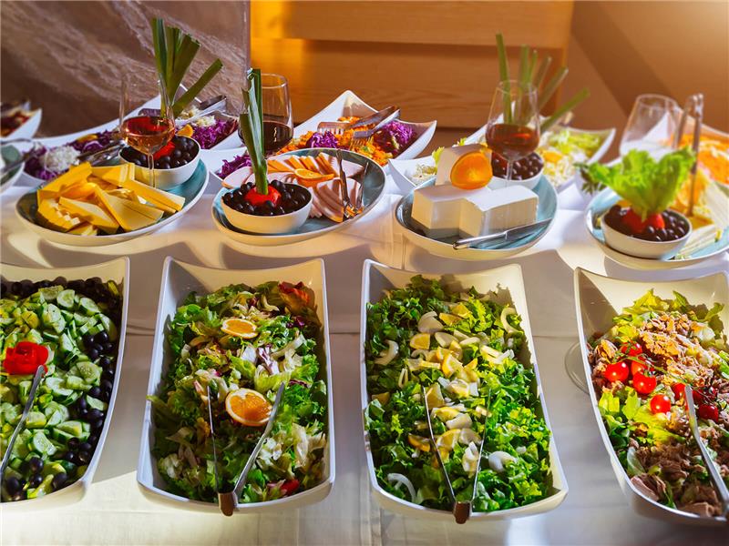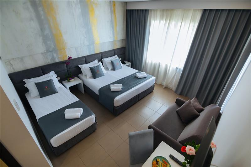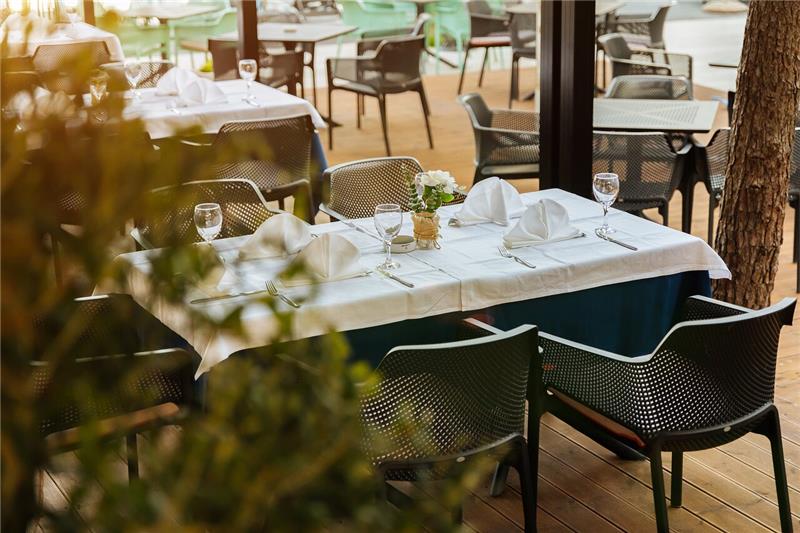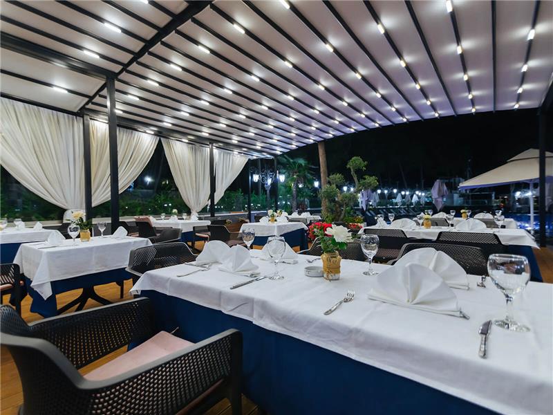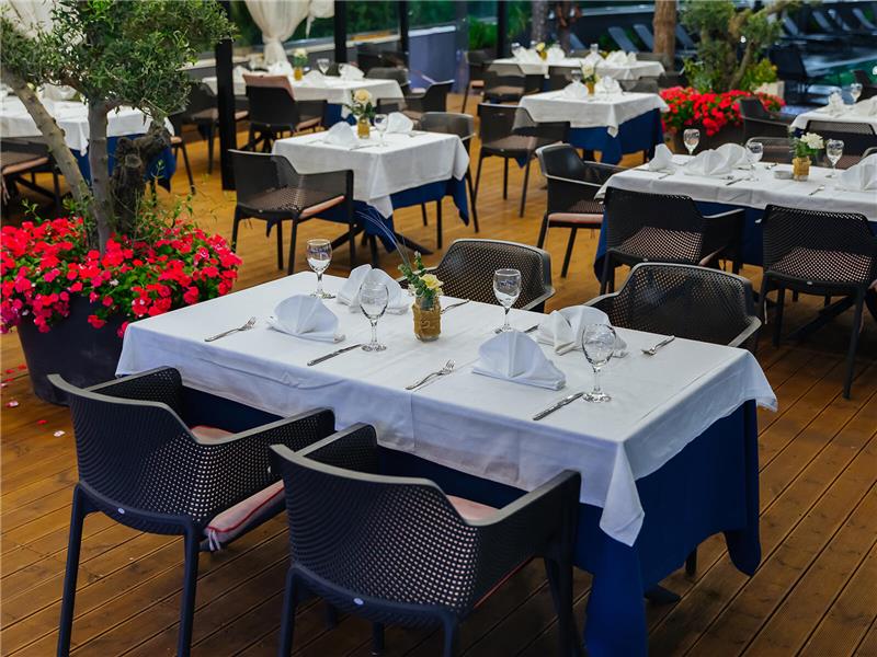 During low season the hotel provide accommodation on breakfasts (B&B), on half board (breakfast + dinner) or full board (breakfast + lunch + dinner) base, in high season (July-August) only stay with B&B or All inclusive package is available. All inclusive package includes room accommodation, breakfast, lunch, snack, dinner buffet, unlimited local drinks from 10:00 till 22:00.