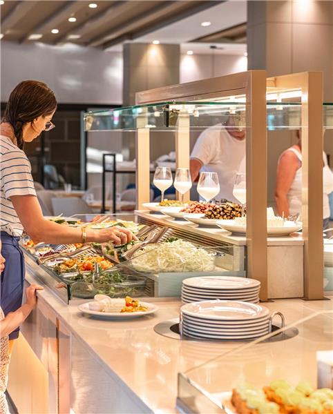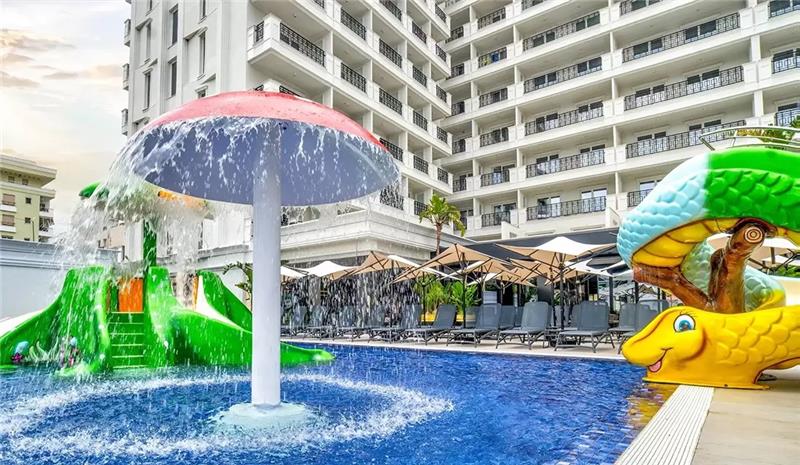 During summer season the hotel offers accommodation with All inclusive package (breakfast, lunch, snack, dinner buffet, unlimited local alcohol/non-alcohol drinks (10.00-22.00), access to the beach & pools & aquapark, beach towels (change of beach towels with extra charge), animation for kids & adults etc.). In low season accommodation can be provided with breakfast or with Half board/Full board.Facilities:
