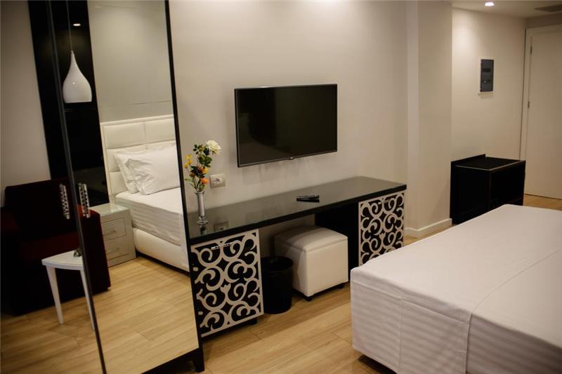 Each room is equipped with an air-conditioning, a LED SMART TV with 15 free channels and internet connection, a safety deposit box, a minibar and a telephone to communicate with the reception. In private bathrooms there are shower cabins, hair dryers, towels and free toiletries. A wardrobe, a work desk and a balcony with table and chairs are also exist in each room.