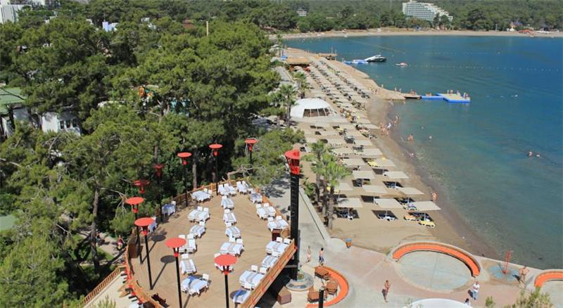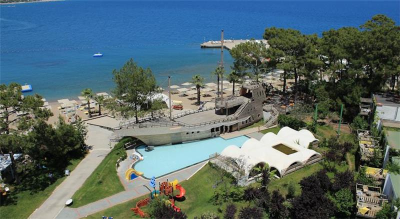 I ndodhur rreze malit Taurus dhe vetem disa metra larg nga bregu i detit me guralec qe laget nga ujrat e kristalta te detit mesdhe shtrihet ky resort i mrekullueshem qe ofron nje cilesi dhe standart te larte sherbimi dhe akomodimi per te gjithe pushuesit e saj. Airoporti i Antalias eshte 50 min larg nga hoteli dhe qendra e Kemerit eshte vetem 10 min larg. Me nje kapacitet prej 275 dhomash moderne dhe te dekoruara ne menyre elegante qe jane te vena ne dispozicionin tuaj. Dhomat jane te ndara ne: dhoma hill, delux hill, delux suites hill duke ju ofruar te gjitha kenaqesite qe ju doni pergjate gjithe qendrimit tuaj ne kete hotel. Hoteli eshte hapur ne vitin 2013 dhe ofron mundesi te pafundme argetimi dhe clodhje sic jane: terrenet sportive ne breg te deti dhe ne fusha te posacme profesionale, sportet ujore per te gjithe te apasionuarit mbas eksplorimit , zhytjeve etj, animacione show dhe spektakle do ju shoqerojne pergjate gjithe qendrimit tuaj ne kete hotel. Qendra e fitnesit, masazheve dhe saunave ofrojne trajtime special per trupin dhe lekuren tuaj . Kend lojrash per femije, miniclub, minidisco etj. Hoteli disponon 1 pishine te jashtme (400 m2 dhe 140 cm ), 1 te brendeshme (64 m2 dhe 140 cm), pishine per femije (116 m2 dhe 40 cm), pishine me 4 rreshqitese (220 m2 dhe 70 cm). Hoteli eshte i pershtatshem per te gjitha moshat si: te rinjte, familjeret, femijet e te gjitha moshave. Baret dhe restorantet – Hoteli operon me sherbimin ultra all inclusive dhe sherben ushqim dhe pije pergjate gjithe dites ne baret dhe restorantet e vena ne dispozicion me nje shumellojshme perzgjedhjesh ne gatime dhe pije vendase dhe nderkombatare. Hill restorant – hapet nga ora 07.00-21.30 dhe sherben vaktet kryesore ne bufe te hapur. Ambjenti i brendeshme ka nje kapacitet prej 140 vendesh dhe 360 vendesh ne ambjent te hapur. Phaselis Snack – hapet nga ora 12.00-17.00 dhe sherben gatime te shpejta snack me nje kapacitet ne ambjent te jashtem prej 150 m. Gozleme Ayran tend – hapet nga ora 11.30-17.00 dhe sherben gatime tradicionale turke. 4 restorante a la carta sherbejne darken tuaj nga ora 19.00-21.30. Vista Restorant – Ka nje kapacitet te jashtem prej 40 personash dhe 60 personash ne ambjent te brendeshem. Ketu sherbehen specialitetet me te mira nga guzhina nderkombatare. Fukei restorant – kapaciteti max 40 persona dhe sherben specialitetet me te mira nga guzhina Kineze. Bay breeze restorant- kapaciteti prej 60 personash sherben gatime speciale me baze peshku dhe proshime deti. Bay barbeque restorant – kapaciteti max 40 persona sherben gatime speciale nga guzhina Turke. Lobby bar, Tarrace bar, Disco bar, beach Camelia bar, Cave bar - sherbejne te gjitha llojet e pijeve duke filluar nga ato vendase dhe nderkombatarer, te ngrohta dhe te ftohta, alkolike dhe joalkolike, kokteile me shije te ndryshme, akullore, embelsira etj.