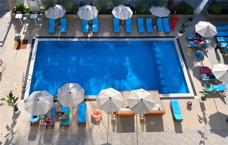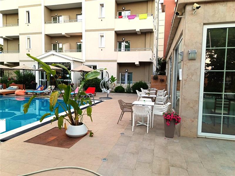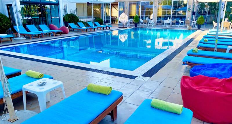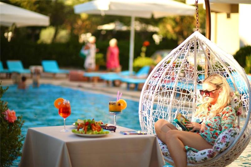 - Shezlonge dhe çadra ne pishine