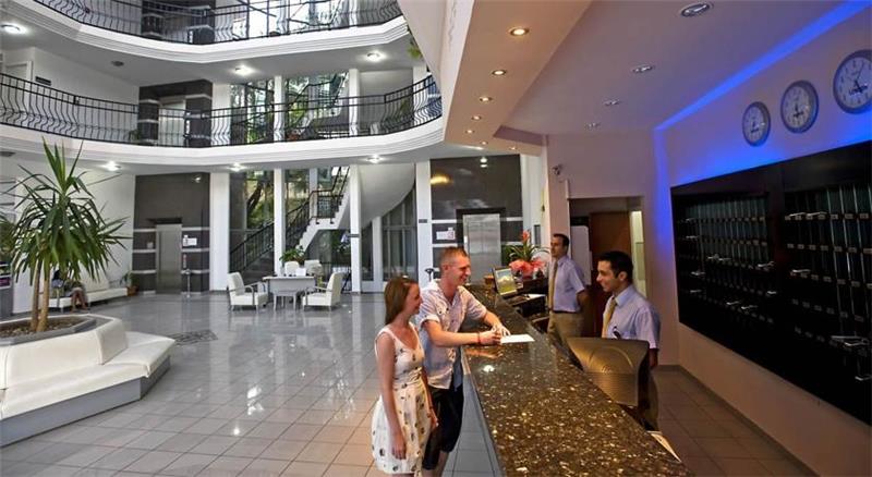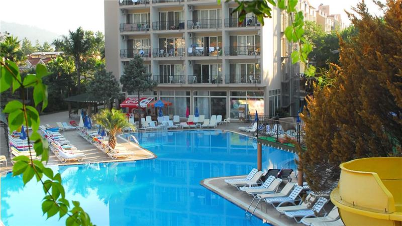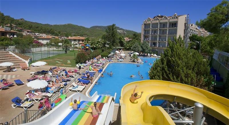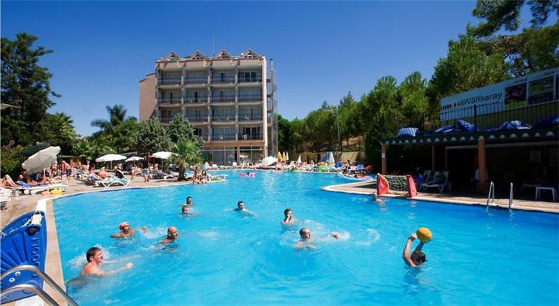 Kervansaray Marmaris eshte nje resort i bukur me nje vendodhje fantastike rrethuar me natyren e bukur perrreth qe eshte i pershtatshme per familjare, te rinjte dhe femijet e te gjitha moshave. Qendra e qytetit te Marmaris eshte vetem 5 min larg dhe eshte nje mundesi e mire per tu argetuar dhe bere shoping. Aeroporti Dalaman eshte vetem 1ore larg ketij resorti te mrekullueshem qe laget nga ujrat e kristalta te detit Egje. Hoteli ve ne dispozicionin tuaj 188 dhoma te mrekullueshme te arredura me kushte luksoze dhe elegante. Dhomat jane te ndara ne: dhoma standarte, dhoma treshe dhe dhoma familjare. Pushuesit mund te argetohen ne pishinat e vena ne dispoziconin sic jane: pishine e brendeshme per te rritur dhe femije, pishine e jashtme per te rritur dhe femije, rreshqitese, aquapark, miniclub etj. Femijet gjithashtu kane ne dispozicion kendin e lojrave per femije, kujdestari etj. Ketu do te gjeni mundesi te pafundme argetimi per te gjitha moshat. Qendra e fitnesit dhe e spa-ve jane ne dispozicionin tuaj me trajtime te vecanta per trupin dhe lekuren tuaj. Animacionet, show-t dhe spektaklet nuk do te mungojne per asnje moment gjate qendrimit tuaj ne kete hotel. Terrene te posacme profesionale ne fusha te posacme dhe ne breg te detit per te gjithe pushuesit qe duan te ndihen vital dhe plot energji, sportet e ujit per te gjithe te apasionuarit e botes ujore dhe nen ujore koralore. Baret dhe restorantet: Hoteli operon me sherbimin all inclusive. Restoranti kryesor sherben vaktet kryesore ne nje menu te pasur dhe hapur duke servirur ushqime jo vetem nga kuzhina vendase por dhe ajo nderkombetare. Pool Snack bar, Restaurant bar, Lobby bar dhe Vitamin Bar sherbejne te gjitha llojet e pijeve vendase dhe te importit, pije te ngrohta dhe te ftohta, alkolike dhe joalkolike, kokteile te ndryshme shumengjyreshe etj.