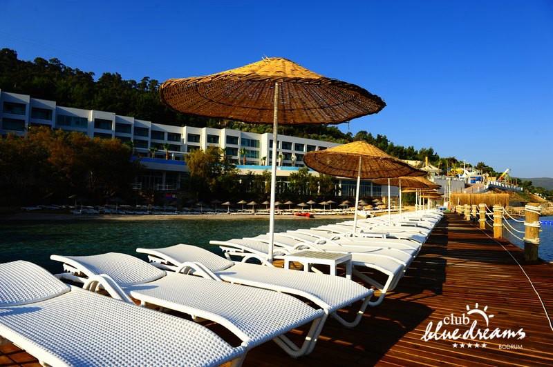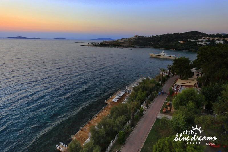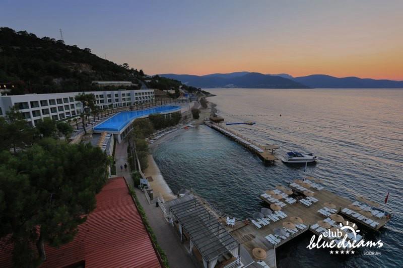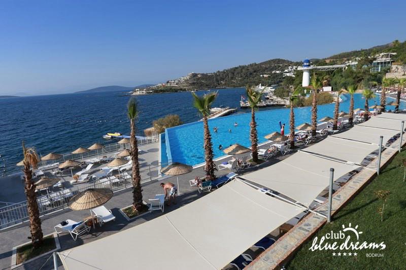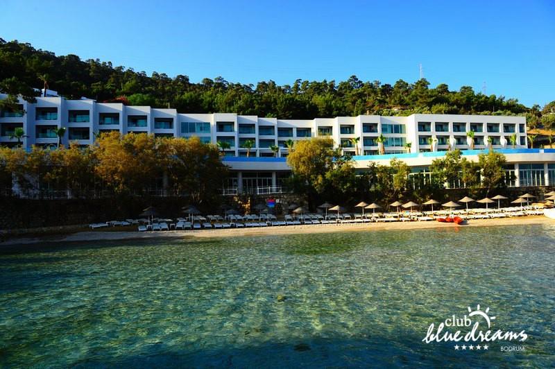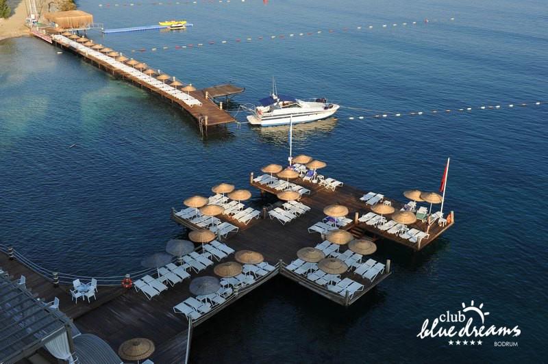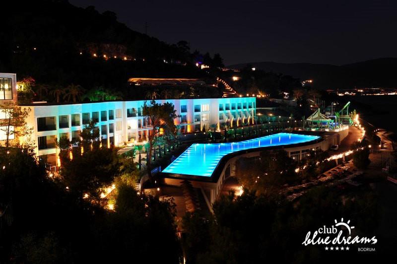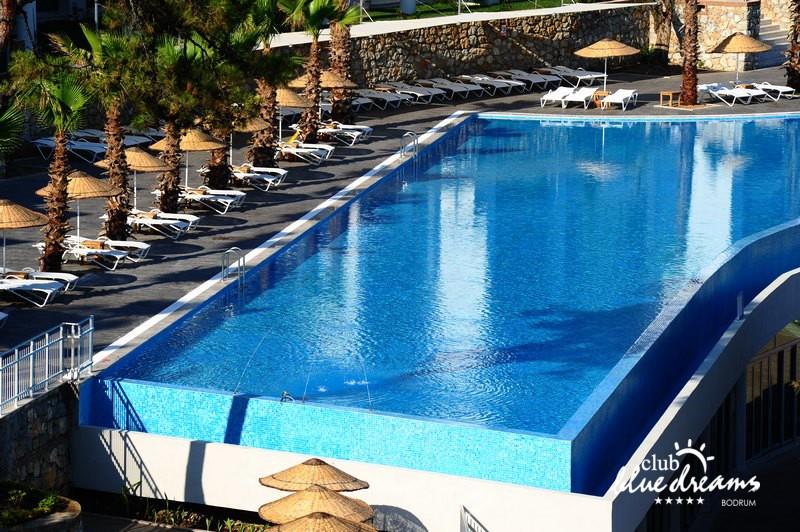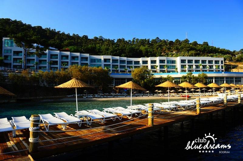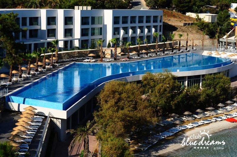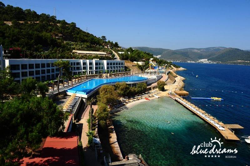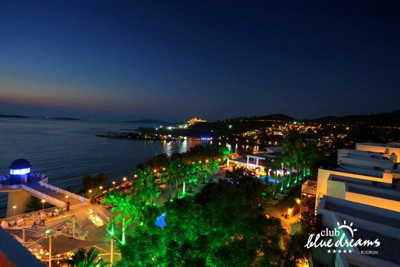 Club blue dreams eshte nje hotel me 5 yje I vendosur ne nje siperfaqe 70000 m2 I cili perfshin plazhin e tij privat ne nje vije bregdetare rreth 700 m. Hoteli eshte I vendosur ne Zeytinli Kahve ne nje nga gjiret me te bukur te Bodrumit, 15 min larg nga qendra e qytetit dhe 30 min nga aeroporti. Ne dispozicionin tuaj do te jene 289 dhoma te cilat jane te arreduara ne menyre moderne dhe komforte. Pushuesit do te kene mundesi te shumta argetimi dhe clodhjeje ne hotel. Per ju ofrohen dy pishina kryesore, nje pishine per femije, nje pishine e brendshme, qender spaje, fitnessi dhe sauna ne te cilat ju do te relaksoheni duke bere trajtime te ndryshme per trupin dhe fytyren tuaj. Aktivitetet fillojne me shfaqje te ndryshme si animacione, shfaqje iluzive, aktivitete sportive si tenis, vollejboll, basketboll, gjimnastike, bilardo, joking etj. Nuk do te mungojne as sportet e ujit ku ju do te keni mundesi te praktikoni serf, banana, canoe,ringo etj. Per femijet tuaj ofrohet nje miniclub ne te cilin ata mund te zhvillojne aktivitete sportive, educative dhe artistike. Gjithashtu ata do te kene nje kendlojerash , aquapark, disco dhe aminacione . Baret dhe restorantet: Hoteli operon me sherbimin all inclusive. Turquoise restaurant eshte restoranti kryesor i hotelit ne te cilin ju do te shijoni ushqime te shumta nga kuzhina turke te servirura ne bufe te hapur. Kebap house ofron nje specialitetine kebapit dhe gatime te kuzhines turke ne nje mjedis te qete dhe te kendshem. Ristorante il fare sherben darken duke ju servirur ushqim Italian. Deep blue a la carte restaurant ofron produktet e peshkut dhe frutat e detit te gatuara ne menyre tradicionale. China Maniaa la carte restaurant sherben darken duke ju servirur ushqim kinez. Pool bar eshte I vendosur ne ambientet prane pishines duke ju dhuruar nje pamje pamoranike dhe te kendshme ne shoqerine e pijeve te ndryshme dhe kokteileve shumengjyrshe. Lounge bar ofron pije alkolike dhe kokteile ne nje mjedis te qete dhe relaksues. Beach bar ofron kokteile te ndryshme per pushuesit qe zgjedhin te pushojne ne plazhin e hotelit. Tea Garden sherben pije te lehta, caj, kafe dhe embelsira ne nje mjedis te ngrohte familiar. Disco bar ndodhet prane plazhit ne te cilin ju mund te shijoni pije te ndryshme ne shoqerine e muzikes moderne. Night club eshte ne dispozicionin tuaj pas mbylljes se disco bar dhe sherben pije si alkolike, joalkolike, vendase dhe te importit te cilat jane me pagese.
