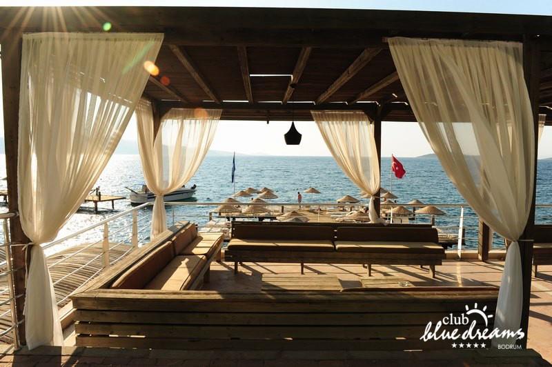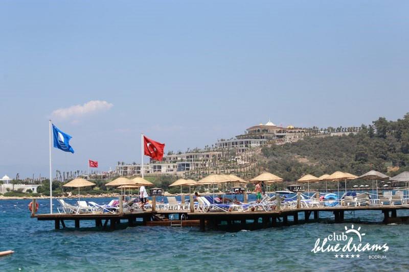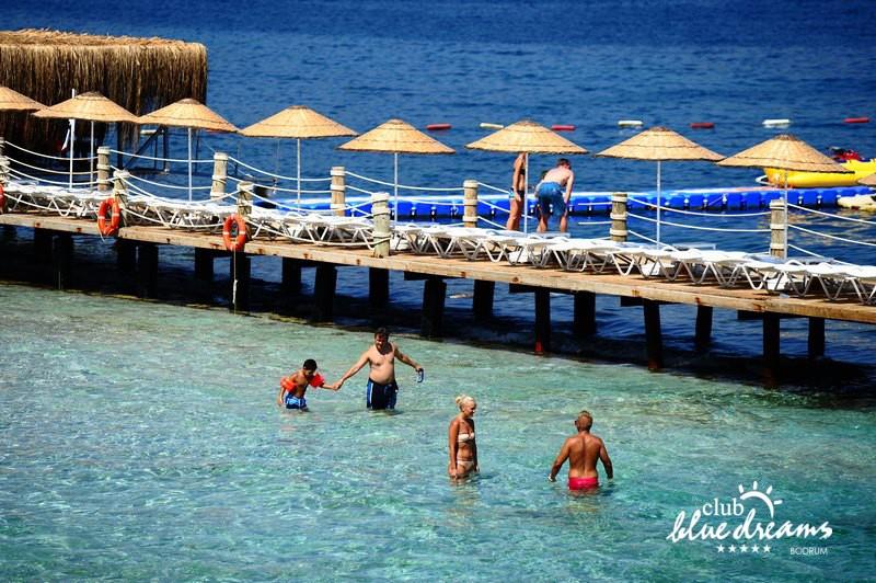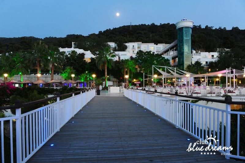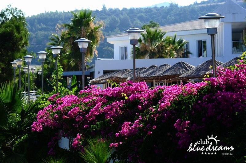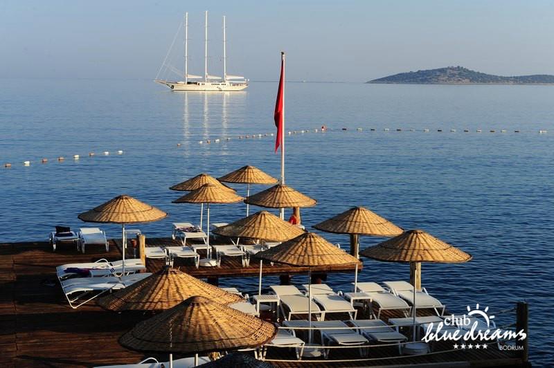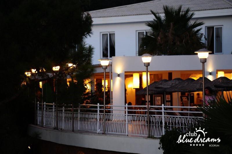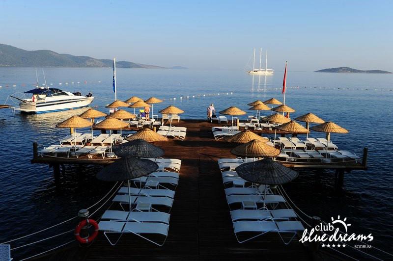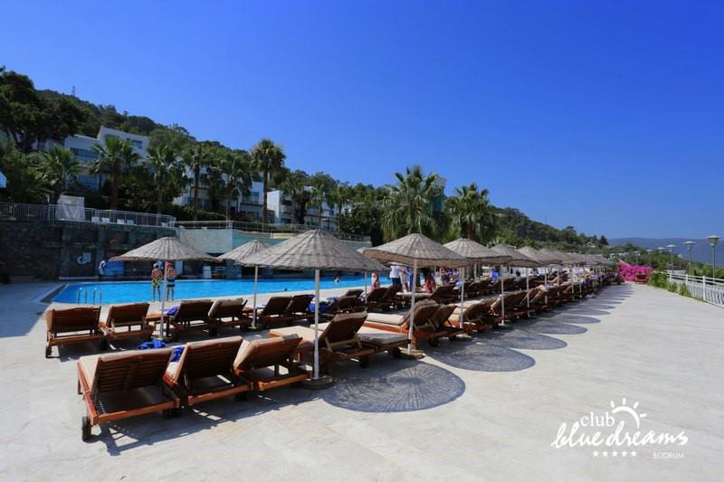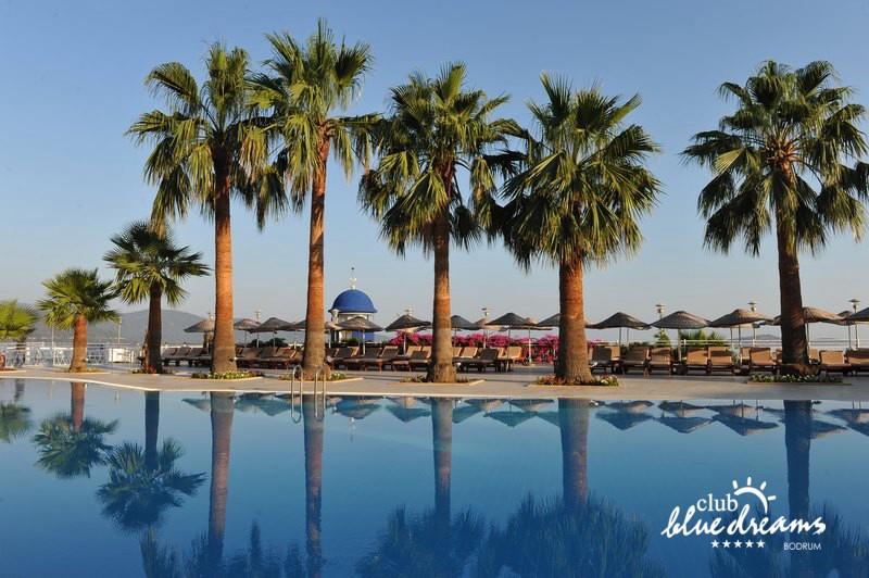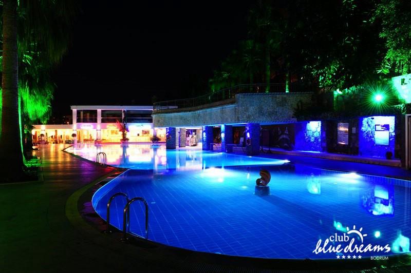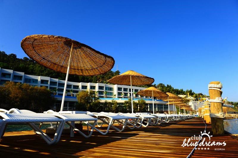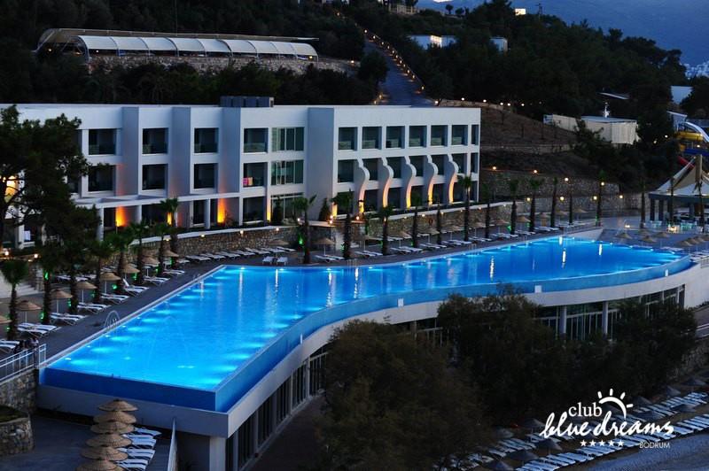 Club blue dreams eshte nje hotel me 5 yje I vendosur ne nje siperfaqe 70000 m2 I cili perfshin plazhin e tij privat ne nje vije bregdetare rreth 700 m. Hoteli eshte I vendosur ne Zeytinli Kahve ne nje nga gjiret me te bukur te Bodrumit, 15 min larg nga qendra e qytetit dhe 30 min nga aeroporti. Ne dispozicionin tuaj do te jene 289 dhoma te cilat jane te arreduara ne menyre moderne dhe komforte. Pushuesit do te kene mundesi te shumta argetimi dhe clodhjeje ne hotel. Per ju ofrohen dy pishina kryesore, nje pishine per femije, nje pishine e brendshme, qender spaje, fitnessi dhe sauna ne te cilat ju do te relaksoheni duke bere trajtime te ndryshme per trupin dhe fytyren tuaj. Aktivitetet fillojne me shfaqje te ndryshme si animacione, shfaqje iluzive, aktivitete sportive si tenis, vollejboll, basketboll, gjimnastike, bilardo, joking etj. Nuk do te mungojne as sportet e ujit ku ju do te keni mundesi te praktikoni serf, banana, canoe,ringo etj. Per femijet tuaj ofrohet nje miniclub ne te cilin ata mund te zhvillojne aktivitete sportive, educative dhe artistike. Gjithashtu ata do te kene nje kendlojerash , aquapark, disco dhe aminacione . Baret dhe restorantet: Hoteli operon me sherbimin all inclusive. Turquoise restaurant eshte restoranti kryesor i hotelit ne te cilin ju do te shijoni ushqime te shumta nga kuzhina turke te servirura ne bufe te hapur. Kebap house ofron nje specialitetine kebapit dhe gatime te kuzhines turke ne nje mjedis te qete dhe te kendshem. Ristorante il fare sherben darken duke ju servirur ushqim Italian. Deep blue a la carte restaurant ofron produktet e peshkut dhe frutat e detit te gatuara ne menyre tradicionale. China Maniaa la carte restaurant sherben darken duke ju servirur ushqim kinez. Pool bar eshte I vendosur ne ambientet prane pishines duke ju dhuruar nje pamje pamoranike dhe te kendshme ne shoqerine e pijeve te ndryshme dhe kokteileve shumengjyrshe. Lounge bar ofron pije alkolike dhe kokteile ne nje mjedis te qete dhe relaksues. Beach bar ofron kokteile te ndryshme per pushuesit qe zgjedhin te pushojne ne plazhin e hotelit. Tea Garden sherben pije te lehta, caj, kafe dhe embelsira ne nje mjedis te ngrohte familiar. Disco bar ndodhet prane plazhit ne te cilin ju mund te shijoni pije te ndryshme ne shoqerine e muzikes moderne. Night club eshte ne dispozicionin tuaj pas mbylljes se disco bar dhe sherben pije si alkolike, joalkolike, vendase dhe te importit te cilat jane me pagese.