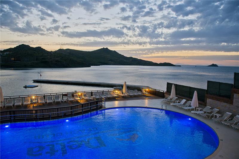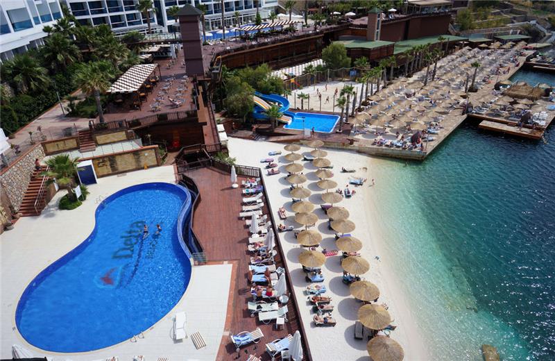 Delta beach resort ndodhet rreth 15 min larg nga qyeteti i Bodrumit, reth 35 min larg nga aeroporti I Milasit dhe vetem pak metra larg nga deti. Resorti eshte rinovuar keto vitet e fundit dhe ofron kenaqesi dhe argetim per te gjitha moshat. Ne dispozicionin tuaj do te jene 200 dhoma. Te gjitha dhomat jane te arreduara ne menyre komode dhe moderne. Ne resort ju do keni mundesi te shumta argetimi, do keni mundesi te relaksoheni ne plazhin e hotelit, pishinen kryesore rreth 300 m2 , ne pishinen relaksuese (120 m2), nje pishine te brendshme, nje pishine te jashtme, gjithashtu ju do te keni mundesi te zhvilloni aktivitete sportive sidomos sportet e ujit, nje qender zhytje pa lene pas dhe aktivitet per femije si miniclub, kend lojerash, kinema etj. Nuk do te mungojne as sauna, banjo turke, dhoma masazhi, qender fitnesi dhe nje sallon bukurie ku ju mund te merrni trajtimet e duhura per trupin dhe fytyren tuaj. Baret dhe restorantet: Ne dispozicionin tuaj do te jene nje restorant kryesor, 2 restorante a la carte dhe disa baret ne te cilet ju mund te gjeni ushqime dhe pije te ndryshme ne ambiente te kendshme. Delta restaurant eshte restoranti kryesor I resortit me kapacitet 500 persona ne te cilin ju mund te shijoni vaktet kryesore me gatime nga kuzhina turke dhe ajo nderkombetare ne bufe te hapur. Italian a la carte restaurant ju servir darken me gatime te kuzhines italiane, restoranti ka kapacitet prej 30 personash. Fish a la carte restaurant ka nje kapacitet prej 30 personash ne te cilin ju mund te konsumoni produktet e peshkut dhe frutat e detit. Snack bar eshte I vendosur ne mjediset prane detit dhe ofron per ju ushqime te lehta dhe te shpejta si dhe pije te ndryshme. Lion bar eshte ne sherbimin tuaj duke ju ofruar nje mjedis te kendshem ne te cilin ju mund te argetoheni dhe nje variete pijesh, pijet vendase jane pa pagese ndersa lengjet e frutave dhe pijet e tjera jane me pagese. Lobby bar ju ofron nje shumellojshmeri pijesh aloolike, joalkolike si dhe kokteile te ndryshme te cilat mund ti shijoni ne nje ambient relaksues dhe te kendshem. Pool bar ndodhet ne mjediset prane pishines ku ju mund te shijoni pije te shumta dhe te clodheni.