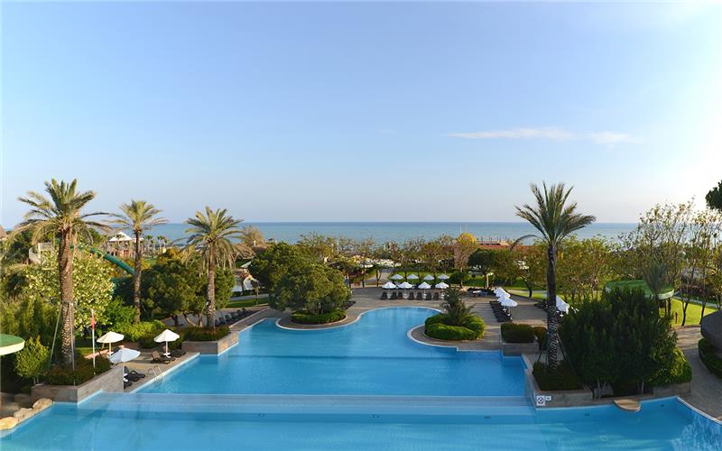 Nje nder hotelet me te bukura te rivieres turke i ndodhur ne mes te gjelberimit afer lumit Acisu dhe vetem disa metra afer detit ndodhet ky hotel i mrekullueshem qe ofron nje cilesi te larte sherbimi dhe akomodimi per te gjithe te ftuarit e saj. Hoteli ka nje siperfaqe prej 2.122.000 m2 dhe eshte i pershtatshem per te gjitha moshat, ciftet, familjaret dhe femijet. Gjate pushimeve tuaja jo vetem mund te pushoni por mund te kryeni nje sere aktivitesh sportive dhe mundesi te pafundme argetimi dhe clodhje te pershtatshem per te gjitha moshat. Qendra e fitnesit dhe e Spa jane ne dispozicionin tuaj me trajtime te vecanta per trupin dhe lekuren tuaj. Animacionet, show-t dhe spektaklet nuk do te mungojne per asnje moment gjate qendrimit tuaj ne kete hotel. Pishine e brendeshme, e jashtme, pishine per femije me rreshqitese, miniclub, kend lojrash dhe kujdestari . Terrene te posacme profesionale ne fusha te posacme dhe ne breg te detit per te gjithe pushuesit qe duan te ndihen vital dhe plot energji, sportet e ujit per te gjithe te apasionuarit e botes ujore dhe nen ujore koralore. Aqua parku eshte gjigant me 8 rreshqitese i ndodhur ne mes te gjelberimit. Shezlongjet dhe cadrat pergjate pishinave dhe ne breg te detit do ju japin momente clodhje dhe relaksi duke ju rrethuar nga natyra e bukur perrreth. Ne dispozicionin tuaj jane 293 dhoma. Dhomat jane te ndara ne: dhome standarte, junior suite, suite, king suite, family suite, gloria villa, executive villa dhe owner villa. Baret dhe Resorantet: Hoteli operon me sherbimin ultra all inclusive dhe sherben ushqim dhe pije pergjate gjithe dites ne baret dhe restorantet e vena ne dispozicion me nje shumellojshme perzgjedhjesh ne gatime nga kuzhina turke dhe ajo nderkombetare. Anatolia Mosaique restoranti kryesor - hapet nga ora 07.00-21.30 dhe sherben vaktet kryesore dhe te ndermjetme ne bufe te hapur nga kuzhina nderkombetare me mundesi te ndryshme zgjedhje sipas shijes dhe deshires tuaj. Lancora a la carte restorant - sherben gatime speciale nga kuzhina italiane. Hapet nga ora 19.00-21.30. Peskaco a la carte restorant- hapet nga ora 19.00-21.30 dhe sherben gatime speciale me baze peshku dhe prodhime deti. Harem a la carte restorant- hapet nga ora 19.00-21.30 dhe sherben gatime speciale nga kuzhina botrore. Turkuaz a la carte restorant - sherben dreken nga ora 12.00-16.00 me gatime speciale nga kuzhina turke. Garden pool bar dhe restorant - sherben mengjesin dhe dreken me gatime te shpejta hapet nga ora 08.00-16.00. Galeon Snack - sherben gatime snack nga ora 12.00-17.00. Lobby bar, oazis bar, garden pool bar, pier bar, galeon bar, gloria pub, sushi bar, aqua bar, pavilion bar - sherbejne te gjitha llojet e pijeve duke filluar nga ato te ngrohtat te ftohtat , alkolike dhe joalkolike vendase dhe te importit, kokteile shumengjyreshe me shije te ndryshme.