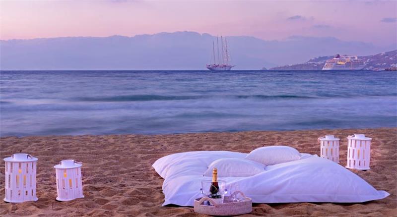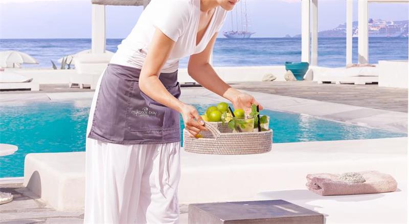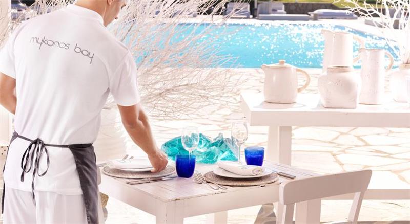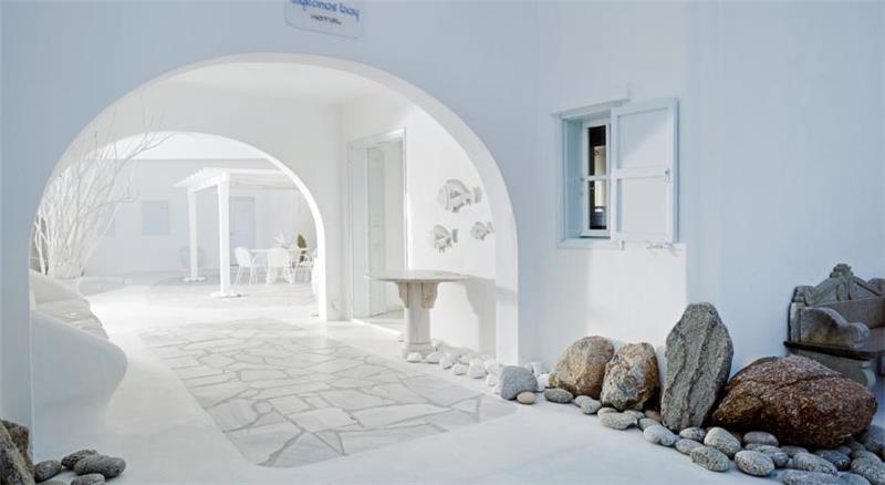 Mykonos Bay Hotel i rinovuar ne vitin 2007 mund te jete vendi ideal per te filluar pushimet tuaja verore ne ishullin e eres, Mykonos. I vendosur ne plazhin Megali-Ammos, eshte afer qytetit te Mykonos dhe jetes se nates qe ofron duke qene njekohesisht nje vend i qete dhe relaksues. Hoteli ka arkitekture tradicionale dhe ofron pamje fantastike te detit Egje, Mullinjve te famshem te eres dhe ishullit te preferuar te Mretereshes Soraya. Hoteli disponon 31 dhoma te dekoruara me stil modern. Te gjitha jane te pajisura me me ajer te kondicionuar, TV satelitor, Internet WiFI, telefon, minibar, kasaforte, banjo me vaske/dush dhe tharese flokesh. Secila nga dhomat ofron pamhe te mrekullueshme. Alisahni Restaurant a la carte prane pishines dhe detit ofron spcialitete mesdhetare dhe lokale. Lounge Coctail Bar, Pool Bar prane pishines dhe Lobby Bar sherbejne pije te ndryshme, kokteje dhe ushqime te lehta gjate gjithe dites deri ne oret e vona te mbremjes. Ndermjet shume sherbimeve dhe lehtesirave te tjera hoteli ofron gjithashtu nje pishine ne natyre, plazh privat, makina dhe bicikleta me qera, transferta nga porti dhe aeroporti etj.