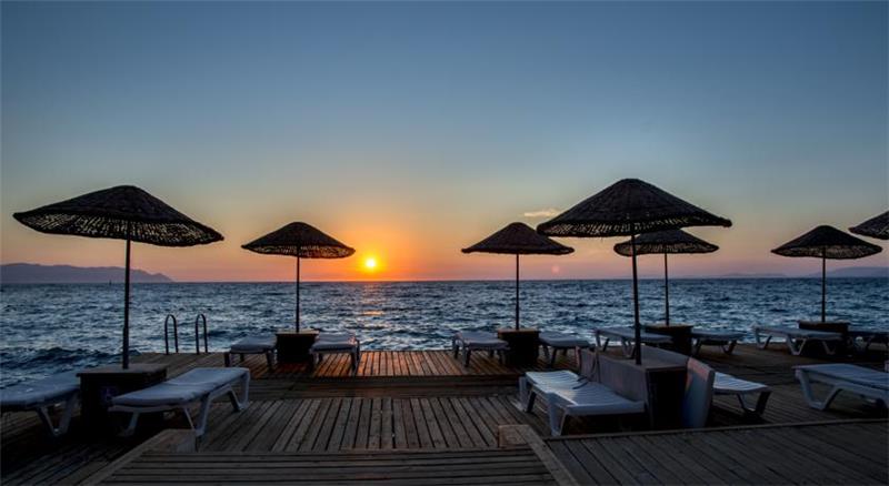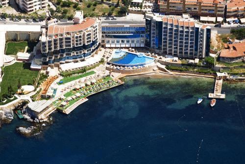 Me pamje te mrekullueshme te Detit Egje, Hotel është vetëm 15 minuta me këmbë nga pazari i Kusadasi, 70 km nga aeroporti. Nuk do ta ndjeni kurre veten me prane historise; Qyteti i lashte i Efesit është 20 km larg, Didyma, Miletus & Priene janë 45 km larg hotelit. 133 Dhoma De Luxe ju ofrojnë shije unike te teknologjisë dhe te comfortit. The janë të pajisura me xhakuzi, TV, kondicioner, minibar, kasaforte, tharëse flokësh dhe internet falas. Nga dhoma edhe nga xhakuzi ju mund të shikoni pamjen shquar të detit Egje. Ne hotel ju do te gjeni argetime te ndryshme te pershatura per te gjitha moshat si aktivite per femije, pishine per femije, miniclub, animacione te ndryshme, show, muzike live, qender spa, sauna, banjo turke, banjo me avull, sallon bukurie, qender fitnesi dhe aktivitete te ndryshme sportive si gjimnastike ne uje, basketboll, vollejboll ne plazh, tenis, bilardo, aerobi dhe sportet e ujit. Baret dhe restorantet : Hoteli operon me sherbimin all inclusive, ne te ju do te gjeni nje shumellojshmeri gatimesh nga kuzhina turke , aziatike dhe ajo Italiane pa lene pas gatimet e produkteve te detit. Restoranti kryesor i hotelit sherben vaktet kryesore dhe vakte te ndermjetme me bufe te hapur e me nje shumellojshmeri gatimesh me kuzhine nderkombetare dhe per te gjitha shijet dhe moshat. Moonlight Serenade dhe restorantet presin te provoni shijet unike të kuzhinës turke dhe ndërkombëtare dhe të shërbimit të tyre të përsosur. Piano Bar Blue Note, ju fton për pamje më të mirë te muzgut të qytetit. Shijoni pijen tuaj te preferuar në baret dhe pasticerite tona.