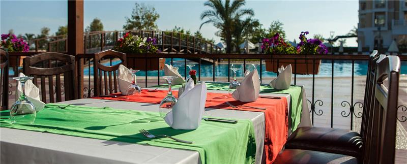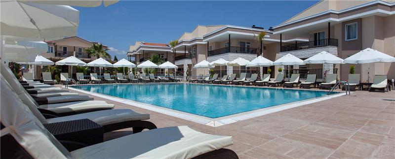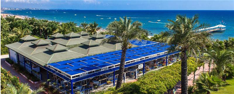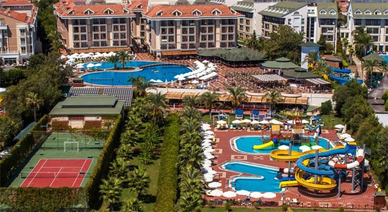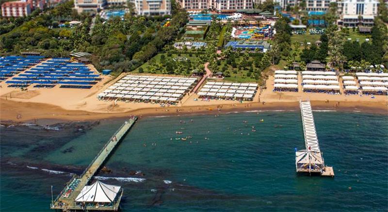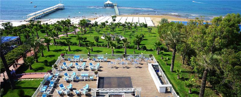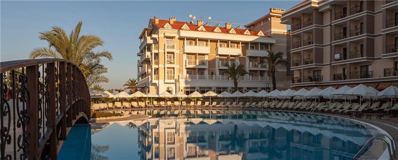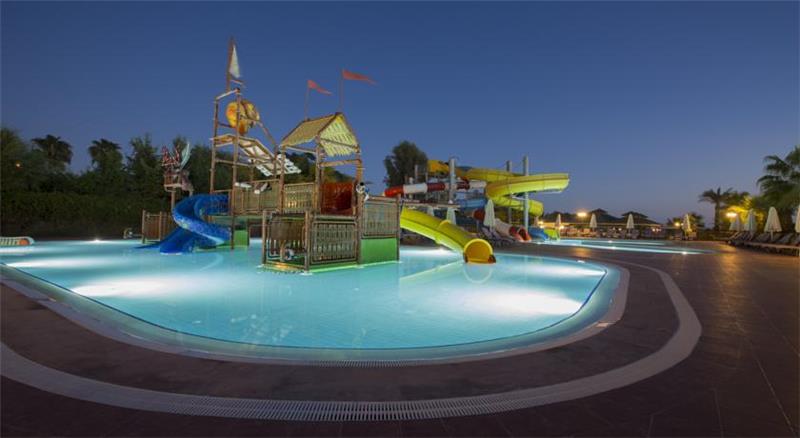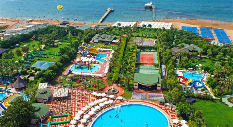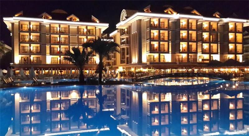 Nje resort i mrekullueshem dhe shume luksoz ofron pushime te paharruara verore per te rinjte, familjaret dhe femijet e te gjitha moshave duke ofruar nje cilesi te larte sherbimi dhe akomodimi per te gjithe te ftuarit e saj. I lokalizuar ne vije te pare me detin me nje dizajn modern, ky hotel ka 313 dhoma hoteli, 52 dhoma familjare, 8 suita, 46 dhoma standarte hoteli park, 17 dhoma familjare standarte park. Dhomat jane te arreduara ne menyre luksoze dhe elegante. Animatoret profesioniste gjate gjithe kohes ju ofrojne vetem buzeqeshje dhe argetim. Lojra, aktivitete sportive, show, skeche, party, mbremje gala, animacione nga me te ndryshmet do te jene vetem per ju gjate gjithe pushimeve. Lunapark, Sauna, Turkish bath, spa center, Jacuzzi, mesazhe, trajtim fytyre dhe trupi, parukeri, Fitness Center, pishine te brendshme, lojra ne pishine, cadra dhe shezlongje pergjate pishinave dhe ne breg te detit duke ju dhene mundesine per te shijoni panoramen e mrekullueshme te zones perreth, terrene sportive ne breg te detit dhe ne fusha te posacme per te gjithe amatoret si dhe sportet e ujit si zhytje , lundrime , canoe , banana etj. Baret dhe Restorantet: Hoteli operon me sherbimin ultra all inclusive dhe sherben ushqim dhe pije pergjate gjithe dites ne baret dhe restorantet e vena ne dispozicion me nje larmi perzgjedhjesh nga guzhina turke dhe ajo nderkombetare.Hoteli ju ofron restorantin kryesor- me kapacitet prej 550 personash ne ambjentet e brendshme dhe 250 persona ne ambjentet e jashtme ,ne te cilin sherbehen te treja vaktet kryesore ne bufe te hapur me ushqime te ndryshme. Belone a la carte restorant – hapet nga ora 19.00-21.30 dhe sherben gatime special nga guzhina turke. Vittorio a la carte restorant – hapet nga ora 19.00-21.30 dhe sherben gatime speciale nga guzhina italiane. Snack restorant Pita Breda- sherben gatime te shpejta snack gjate gjithe dites dhe ne oret e vona te nates. Lobby bar, Bar ne pishine, Snack bar, Disco bar, White & Purple bar dhe Cafe Turk- me pije alkolike dhe jo alkolike- sherbejne te gjitha llojet e pijeve duke filluar nga ato vendase dhe te importit , te ngrohta dhe te ftohta , alkolike dhe joalkolike , embelsira dhe akullore si dhe kokteile shumengjyreshe me shije te ndryshme.