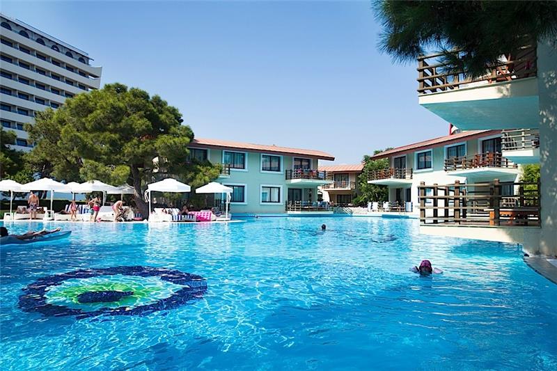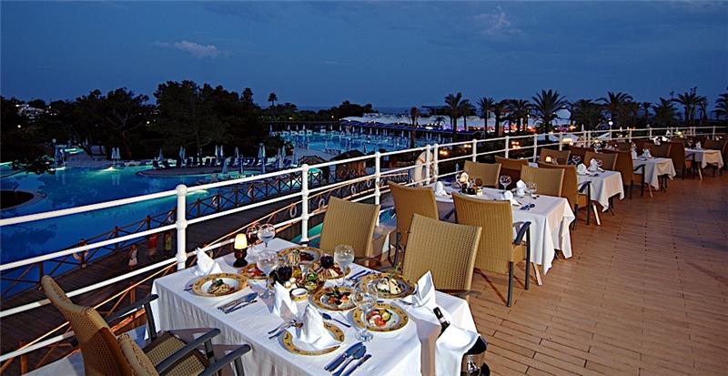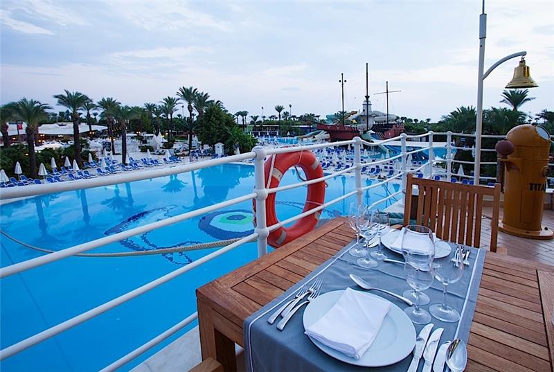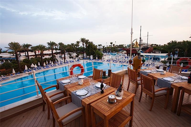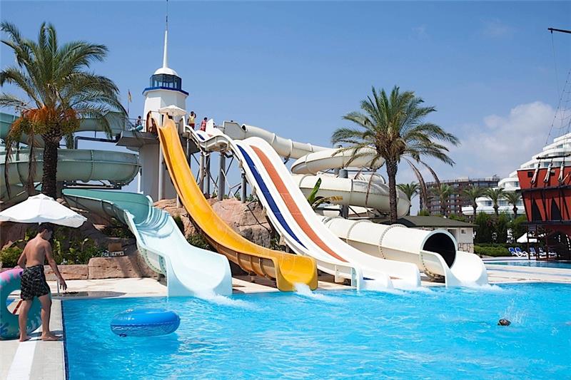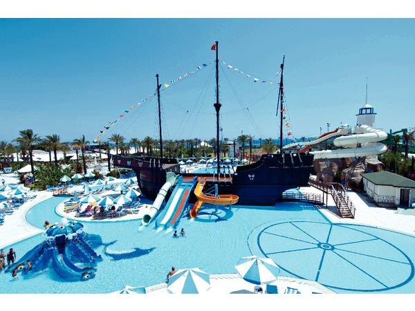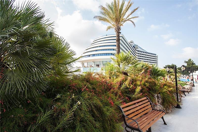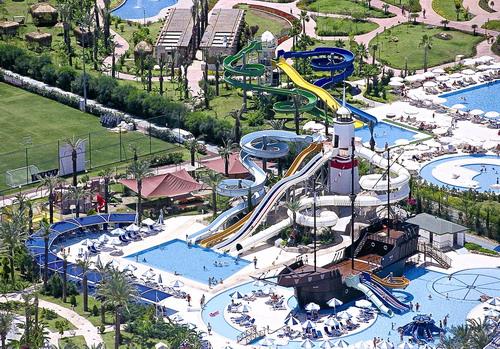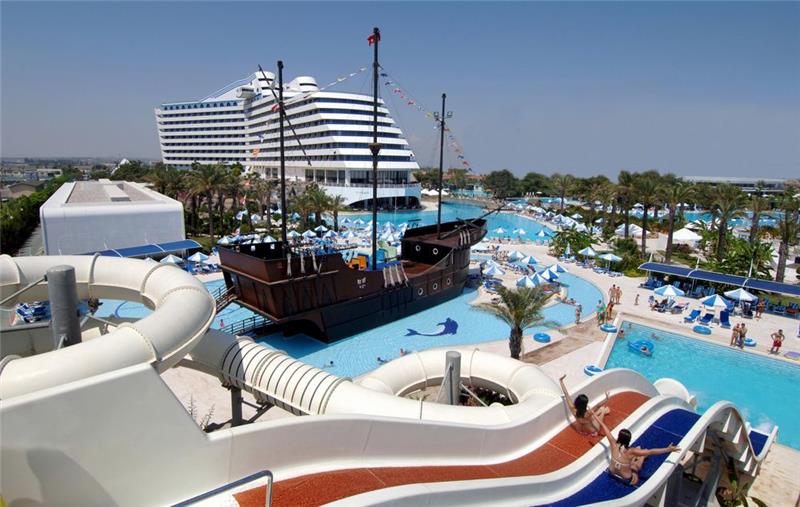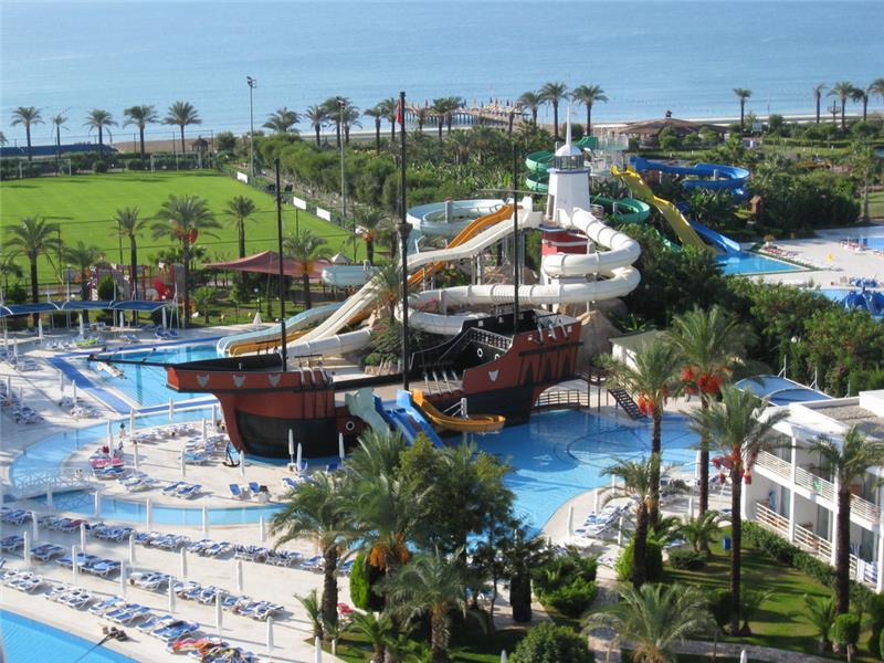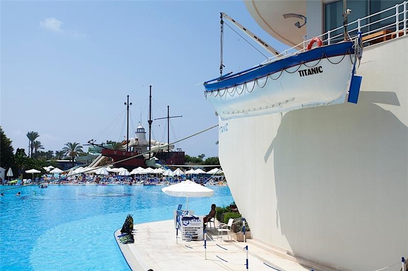 E ndertuar me nje arkitekture te vecante ne formen e nje anije, e ka mare emrin nga anija e famshme Titanik. Ka 589 dhoma ne total dhe 1224 shtreter me stilin e tyre te vecante ndahen ne 520 dhoma standarte, 30 dhoma familjare, 12 kolonel suita, 9 junior suita, 4 admiral suita dhe 6 royal villa. Te gjitha jane te pajisura me ajer te kondicionuar, ballkon, banjo me dush, vaske, tharese flokesh,telefon, WI-Fi dhe internet, hapje e deres me karte elektronike, garderobe, sherbim lavanderi dhe pastrimi kimik. Me pishina përreth saj duke u shtrire ne një sipërfaqe prej 6000 m², Titanic Beach Resort qëndron si një anije e ankoruar në ujë. Pra te gjithe pushuesit kane mundesi zgjidhje per pishinen qe deshirojne, pasi hoteli na ofron 1 pishine te jashtme (4300 m2), 1 pishine te jashtme per femije (277 m2), 1 pishine te jashtme (1250 m2) si dhe pishine te brendshme per te rritur dhe per femije, akuapark dhe rreshqitese. Aktivitet zbavitese dhe show fillon qe ne mengjes dhe zgjat deri ne oret e para te mengjesit, aktivitete sportive si ne uje dhe ne toke jane te shumta si: parasailing, jet ski, water ski, banana, ringo, surfing, ndeshje volejbolli,fushe futbolli, fushe basketbolli, 4 fusha tenisi,spa , jacuzi, banjo turke, sauna, banjo me avull, trajtim i trupit, masazhe te ndyshme, qender fitnesi me te gjitha pajisjet, sherbim ne dhome, sherbime mjekesore, qender tregtare, mini klub. Baret dhe Restorantet: Hoteli operon me sherbimin all inclusve dhe sherben gatime dhe pije te ndryshme pergjate gjithe dites ne baret dhe restorantet e vena ne dispozicion me mundesi te ndryshme perzgjedhje sipas shijes dhe deshires tuaj. Parkfora restorant - eshte restoranti kryesor qe na ofron ky hotel ku sherbehen te treja vaktet ne bufe te hapur me mundesi perzgjedhjesh ne gatime. Restorantet a la carta sherbejne darken tuaj ne ambjente luksoze dhe duke ju ofruar nje panorame te mrekulleushme dhe hapen nga ora 19.00-21.30. Hasir A La Carte restorant – sherban gatime speciale nga guzhina tradicionale turke. Sapore A La Carte restorant- sherben gatime speciale nga guzhina italiane. Capari A La Carte restorant- sherben gatime me prodhime te fresketa deti dhe peshku. Lobby Patisserie- sherben embelsira, caj dhe kafe pergjate gjithe dites. Cornelya Lobby bar, bari ne pishine, Vitamin Bar, Otag Tent, Stella Snack Bar, bar ne bowling, Solirus Snack bar, Submarine disko- sherbejne embelsira, caj, kafe dhe te gjitha llojet e pijeve vendase dhe te importit, alkolike dhe joalkolike, te ngrohta dhe te ftohta, kokteile te ndryshme shumengjyreshe etj.